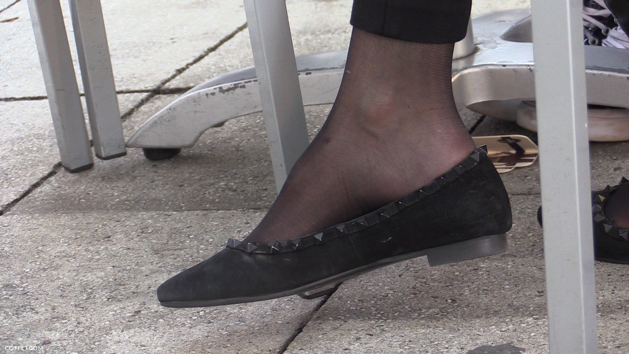 Most of the time the lady had her flats half off and leaned the heel on the ground. Here and then she rose her foot and dangled her shoe in the air.