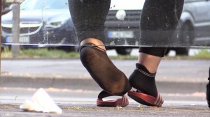 And the socks… Not only are they glancing in the sun, a certain sign of “we are not the first day on those feet” – but the black color of the socks at the underside of her toes is gone completely!